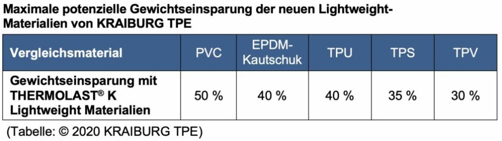 Die neuen Lightweight-TPE lassen sich auf gängigen Anlagen wirtschaftlich spritzgießen und extrudieren. Neben signifikanten Gewichtseinsparungen (siehe Tabelle) und sehr homogenen Oberflächen liefern sie zudem hervorragende Werte beim Druckverformungsrest (Compression Set). Produktionsabfall ist direkt recycelbar.